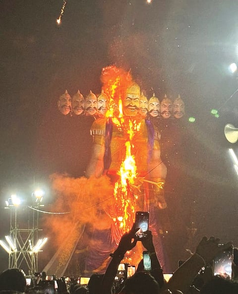 PALASBARI: Dussehra was celebrated with the participation of around 10,000 people at RBHS and MP School playground at Mirza by Sarpara Friends Club on Sunday. A 150-foot-tall statue of Ravana was burnt on the occasion of Dussehra on Sunday.