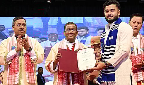 Eminent journalist and litterateur Kanaksen Deka was conferred upon with the honorary D.Litt. degree for his significant contribution to journalism, Assamese literature, and culture. Two students of the BA Programme for Sportspersons—Riyan Parag and Anyatam Rajkonwar—also received their degrees on Wednesday.