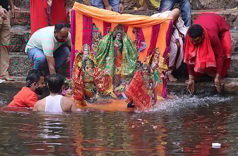 The Durga Puja celebrations began on Friday. On this day ‘Akaal Bodhon’ or the evocation of the Goddess Durga idol was done, which also includes the unveiling of the face of the idols to be displayed for puja. According to popular belief, on this day, Goddess Durga comes to her father’s house with her children. After the final round of pujas are conducted on Dashami, which fell on Tuesday this year and the completion of the celebrations, the idols used for the puja celebrations over the past few days were removed from the pedestal and moved towards the allocated ghats for emersion. A large number of devotees accompanied the vehicles which carried the idols along the designated routes through the city. The district administration had already issued a set of regulations for traffic as well as public movement on the day to ensure that the immersion of the idols is conducted safely.