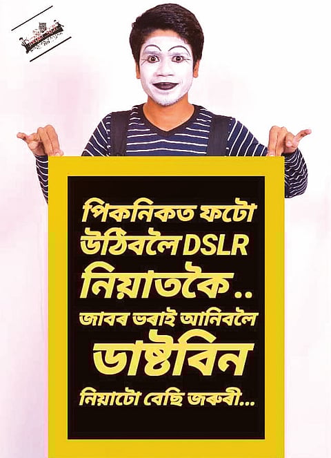 One of his themes reads ‘challo picnic dhyan se’. His placard messages read ‘carry a dustbin instead of a DSLR to the picnic spot to carry garbage; don’t throw liquor bottles in the river, but bring them back to store edible oil in them; click selfies with the rivers and make them popular, but don’t pollute them with plastics; get your picnic spot cleaned before leaving it” etc. Minangka hopes that such a campaign will make picnic goers not to litter picnic spots and clean them before leaving for home. In 2018, Minangka and his troupe did perform a mime play at Deepor Beel on environmental issues. The troupe is ready to stage such performances this year as well.