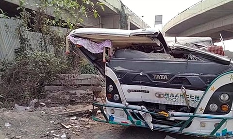 GUWAHATI: In a horrific road accident, an over-speeding dumper truck fell off the Jalukbari flyover atop a parked city bus on Tuesday morning. The driver of the dumper, Kismat Ali (24) died on the spot and the handyman has been admitted to a hospital in critical condition. The deceased driver was from Tura, Meghalaya.