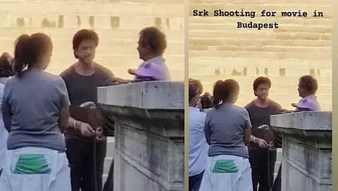 A photograph of Bollywood superstar Shah Rukh Khan from the sets of Rajkumar Hirani's upcoming film 'Dunki' in Budapest has been leaked on social media and gone viral. The 56-year-old superstar's fan club shared his BTS pictures from the sets, showing him looking dapper in an all-black ensemble, engaged in a conversation with the director, even as the rest of the crew mill around them.