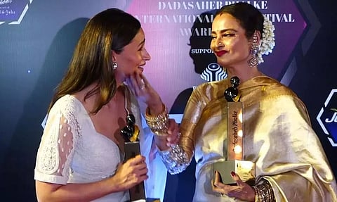 With the bigwigs of Bollywood attending the Dadasaheb Phalke International Film Festival Awards on Monday, veteran actor Rekha was seen sharing a special moment with Alia Bhatt. For the star-studded gala event, while Rekha exuded elegance in her muted white and gold silk saree, Alia looked breathtaking in her sheer white saree with embroidered detailing. Rekha tied her hair in the signature sleek bun, with gajra tied over it.