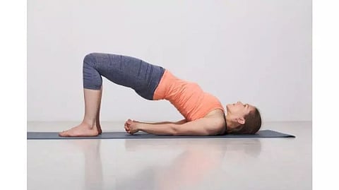 Steps: Lie on the floor, bend your knees and set your feet on the floor, heels as close to the sitting bones as possible. Exhale and, pressing your inner feet and arms actively into the floor, lift the buttocks off the floor. Keep your thighs and inner feet parallel. Clasp the hands below your pelvis and extend through the arms to help you stay on the tops of your shoulders. Lift your chin slightly away from the sternum and, firming the shoulder blades against your back, press the top of the sternum toward the chin. Firm the outer arms, broaden the shoulder blades, and try to lift the space between them at the base of the neck up into the torso. Stay in the pose anywhere from 30 seconds to 1 minute. Release with an exhalation, rolling the spine slowly down onto the floor. (IANS)
