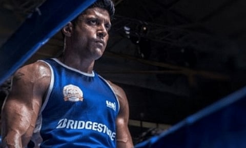 The first still from Farhan AKhtar's upcoming film "Toofan" is out and he is looking no less than a professional boxer. In the image, Farhan is seen standing at a boxing ring, donning a blue jersey and flaunting his ripped muscles.