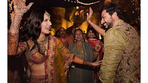 Celebrity couple Vicky Kaushal and Katrina Kaif, who recently got married, have shared the pictures from their 'Sangeet' ceremony.
