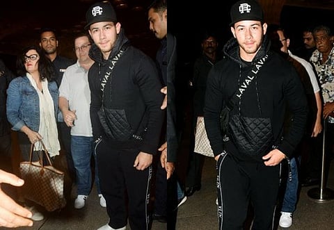 American pop singer Nick Jonas and his parents left from India to the US, two days after solemnizing his relationship with actress Priyanka Chopra. Nick and his parents left India late on 19 August night. He sported on the airport in an all-black ensemble paired with white sneakers. His mother Denise wearing a denim top with black pants and carried a classic Louis Vuitton tote bag. Nick's father Paul was dressed in a white t-shirt and blue jeans. As the 'Chains' singer entered the airport, he waved a goodbye to the Indian paparazzi.