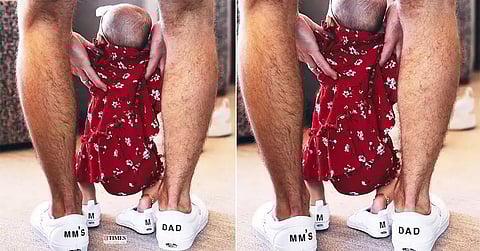 Indian actress Priyanka Chopra Jonas shared an adorable photograph of her husband Nick Jonas and daughter Malti Marie twinning with Nick in customised shoes. Priyanka took to Instagram, where she shared the photograph of Nick standing with his back towards the camera, holding their little baby girl, who wore a wine coloured dress. Malti Marie is in white sports shoes with 'MM' written on them, Nick's shoes have 'MM's Dad' written on them.