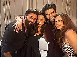 In the first and the third picture, the lead cast of the film Ranbir Kapoor, Deepika Padukone, Aditya Roy Kapur and Kalki Koechin can be seen posing for a happy group picture in casual attire.