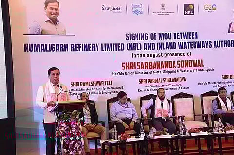 GUWAHATI: The Union Minister of Ports, Shipping, and Waterways and Ayush Sarbananda Sonowal attended the historic Memorandum of Understanding (MoU) signing ceremony between the Inland Waterways Authority of India (IWAI) and Numaligarh Refinery Limited (NRL) to use National Waterways-2 (Brahmaputra) and the Indo Bangladesh Protocol Route (IBPR) for the export of petroleum products to Bangladesh and other south-east Asian countries here on Thursday.