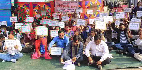 Slogans raised by members of the All Assam Matak Yuba-Chatra Sanmilan (AAMYCS), All Assam Safai Karmi/Covid Warriors (Ward boys and Laboratory Technician), and Nikhil Bishnupriya Manipuri Mahasabharended the air of the ground.