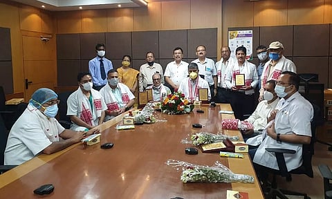 Then felicitation and a citation were offered to Dr. Amal Kotoki, Director BBCI, and Dr. Joydeep Purkayastha, HoD Oncology at B Baruah Cancer Institute. After this at Mahendra Mohon Chaudhury Hospital, felicitation and citations were offered to Dr. K K Deka, Superintendent, and Dr. Anup Kr Das, Asstt Superintendent.