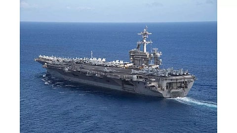 The silhouettes of a US aircraft carrier and at least one warship can be seen on a railway track in photographs obtained by Colorado-based satellite photography provider Maxar Technologies on Sunday.