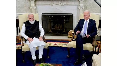 At the start of their meeting Modi, dressed in white pyjama kurta and dark waistcoat, made the namaste gesture. Biden stretched out his hands and embraced Modi. (IANS)