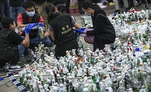 Hong Kong: Dozens of bottles containing dangerous chemicals, including highly corrosive acids, were discovered on Thursday at a park here, prompting Hong Kong police to investigate if the substances had been stored there by anti-government protesters.