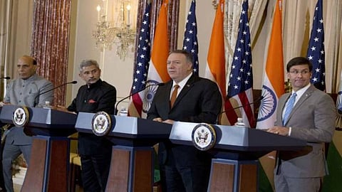 India's Defence Minister Rajnath Singh and Minister of External Affairs S. Jaishankar participated in the high-level meeting on Wednesday with US Secretary of State Michael Pompeo and Secretary of Defense Mark Esper. Citing the "pretty clear language" in the 2+2 joint statement, the official underlined the key role that the Financial Action Task Force (FATF), which combats terrorism funding, plays "with regard to Pakistan." The joint statement also calls out the terrorist role of "al-Qaeda, ISIS/Daesh, Lashkar e-Tayyiba, Jaish-e-Mohammad (JeM), Haqqani Network, Hizb-ul Mujahideen, TTP, and D-Company" and asks Pakistan to "take immediate, sustained and irreversible action to ensure that no territory under its control is used for terrorism against other countries in any manner, and to arrest and prosecute the perpetrators of cross-border terrorist attacks, including 26/11 Mumbai and Patha-nkot." (IANS)