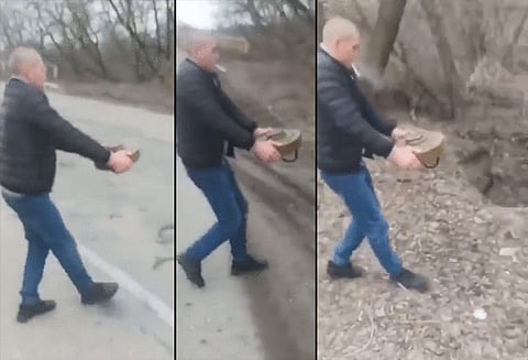 The incident was recorded in Berdyansk, south-east Ukraine where this man went ahead bravely to remove the anti-tank mine by a roadside.