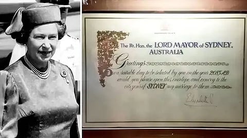Addressed to the Lord Mayor of Sydney, the instruction reads: "On a suitable day to be selected by you in the year 2085 A.D, would you please open this envelope and convey to the citizens of Sydney my message to them."