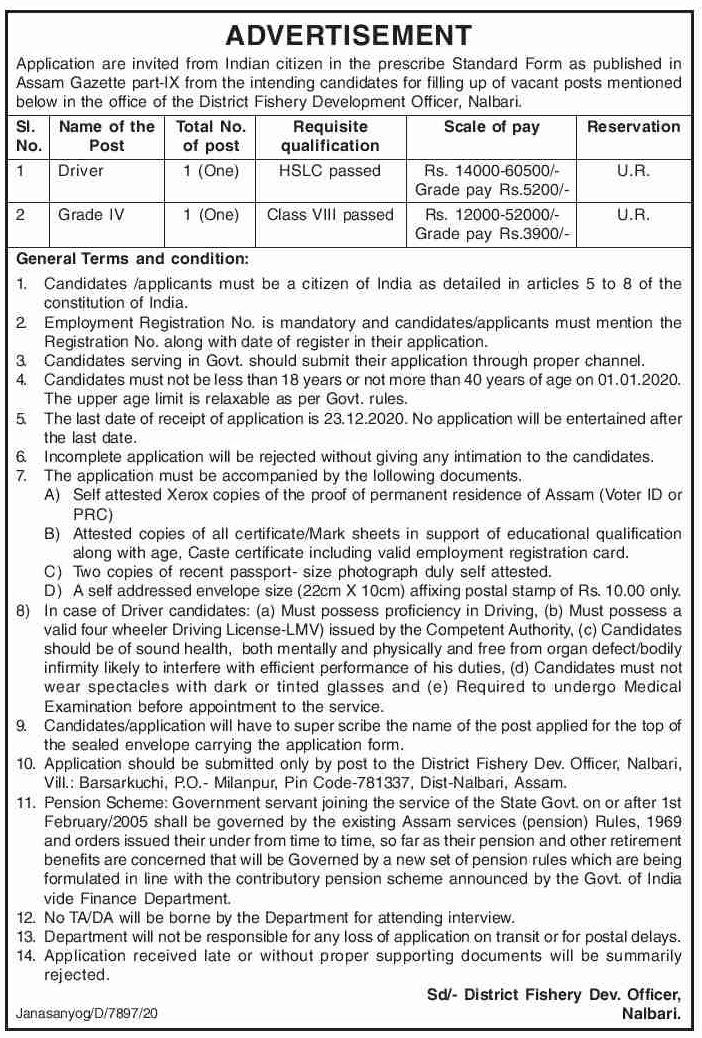 Fishery Development Officer Nalbari has published a notification for the recruitment of Driver and Grade IV vacancy in the office of the District Fishery Development Officer, Nalbari. Interested and suitable candidates can apply for the vacant post before the last date confirmed.