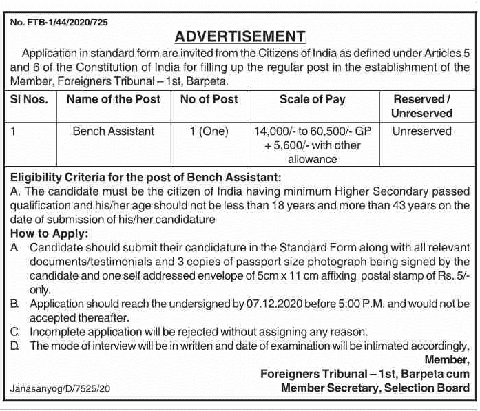 Foreigner tribunal Barpeta has invited applications from qualified candidates for the recruitment of 1 Bench Assistant Vacancy in the establishment of the Member, Foreigners Tribunal. Interested candidates can check all the job details of no of posts, Age limit, Qualification, Salary etc given below: