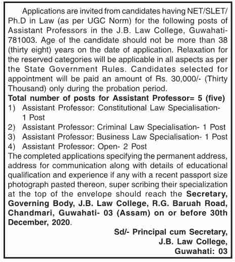 Jnanadabhiram Barooah known as J. B. Law College, Guwahati has invited application from qualified candidates for the recruitment of Assistant Professor vacancy. Intending candidates can apply for the vacant post before the last date confirmed.