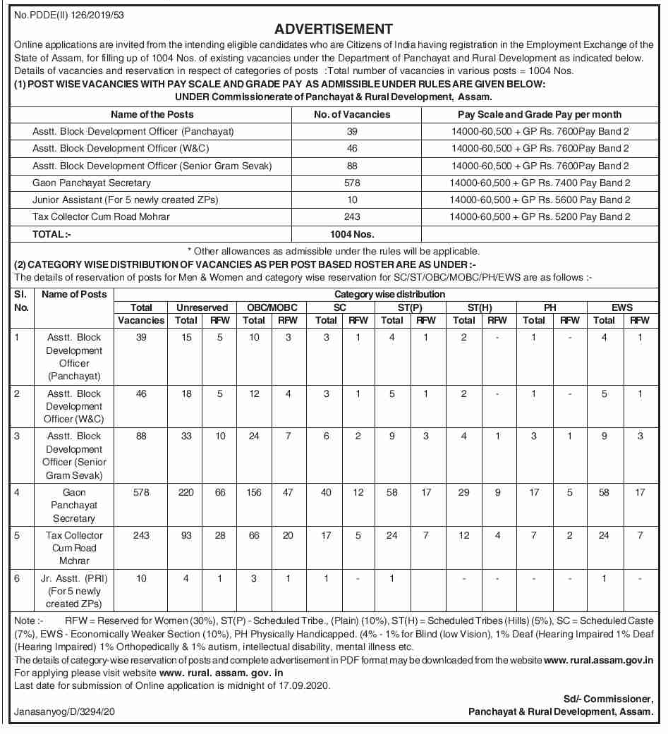Post name: Asstt. Block Development Officer (Panchayat)No. Of posts: 39Salary: 14000-60,500 + GP Rs. 7600 Pay Band 2Location: Assam Last date: 17/09/2020To Apply: For applying please visit website www.rural.assam.gov.in For details: click here