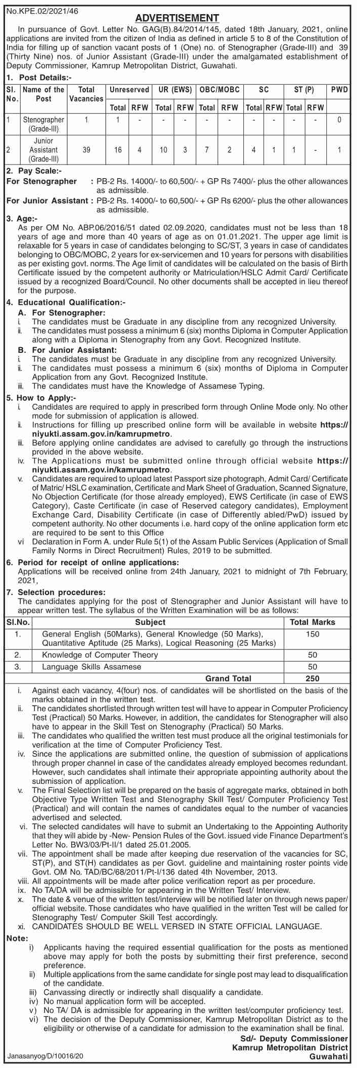 DC Kamrup Metro Job Recruitment 2021 - 40 Stenographer & Junior Assistant Vacancy, Job Openings