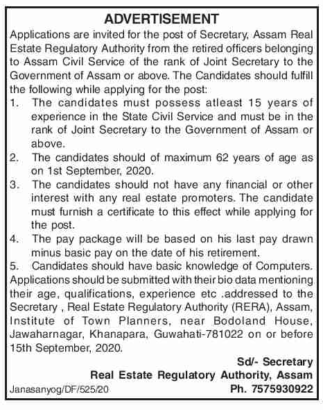 To Apply: Applications should be submitted with their bio data mentioning their age, qualifications, experience etc addressed to the Secretary, Real Estate Regulatory Authority (RERA), Assam, Institute of Town Planners, near Bodoland House, Jawaharnagar, Khanapara. Guwahati-781022 on or before 15th September, 2020.
