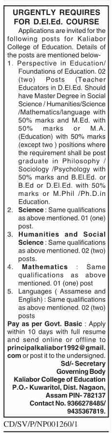 To be suitable for the advertised post of Teacher Educator in Kaliabor College of Education, candidates should have qualified Master Degree in Social Science / Humanities/ Science /Mathematics/ Language with at least 50% marks and M.Ed. with 50% marks or M.A. (Education) with 50% marks (except two ) positions where the requirement shall be post graduate in Philosophy / Sociology /Psychology with 50% marks and B.EI.Ed. or B.Ed or D.ELEd. with 50% marks or M.Phil /Ph.D.in Education.