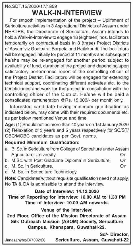 Directorate of Sericulture, Assam has recently published a notification for the recruitment of 18 Facilitator vacancy on contractual basis in 3 (three) Project Districts of Assam namely Goalpara, Barpeta and Hailakandi. Interested candidates can apply for this post as per prescribed details below: