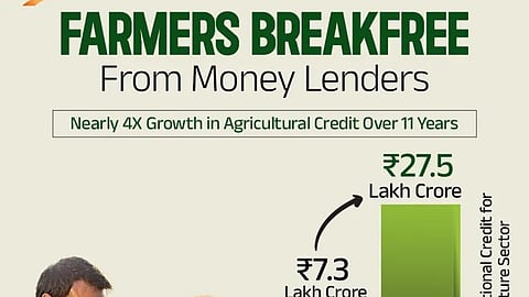 New Delhi: In the last 11 years under the Prime Minister Narendra Modi's government, institutional credit to agriculture has surged from Rs 7.3 lakh crore to Rs 27.5 lakh crore, the Ministry of Finance said on Saturday.