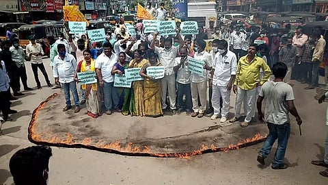 AMARAVATI: Telugu Desam Party (TDP) supporters and cadres demonstrated against the Andhra Pradesh government over rising fuel prices on Saturday. Hundreds of supporters responded to a call given by TDP national president and former chief minister N. Chandrababu Naidu to stage mass protests against rising prices of fuel and essential commodities.