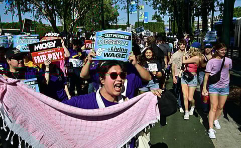 Slogans among the signs being carried included “Mickey would want fair pay” and “Disney, don’t be the villain” at the march in Anaheim, near Los Angeles. “We deserve fair wages,” said 44-year-old Disneyland employee Ginny Cristales.