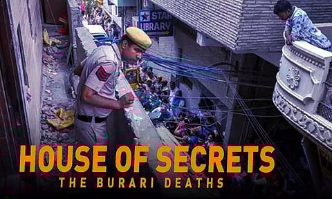 The documentary explains the situation where 11 dead bodies were discovered hanging in north Delhi in a living room of a house. The bodies were found by the neighbours when they thought that something is wrong and confusing in that house so they informed the police. Locals have surrounded the place to have a look of the bizarre crime and Arvind Kejriwal CM of Delhi reached the crime scene just an hour later after hearing the news. Leena Yadav and Anubahv Chopra made their focus mainly on the neighbours, the investigators who investigated the case, the friends and other close relatives. The case is now a closed case but the documentary House of Secrets doesn't investigate the incident but tries to develops the discussions around it. The show basically surrounds in the situations where the son Lalit of the late father claims that he is possessed by the spirit of his father, his wife being literally subjugated shows miracles and the family keep their domestic matter as a secret. It focuses on highlighting the patriarchal role in the deaths of the Burari and according to a clinical hypnotherapist in the show the final episodes were more rewarding.