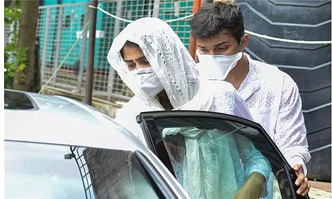 Rhea, widely rumoured to have been the late actor's girlfriend, arrived at the police station dressed in white and wearing a mask.