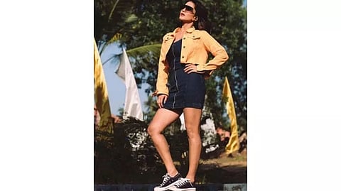Sunny Leone shared a string of sun-kissed images on Tuesday that capture her basking in golden glow. In the Instagram pictures, Sunny sits in a denim short dress paired with a tan jacket. To complete her look, she wears sneakers and chunky sunglasses.
