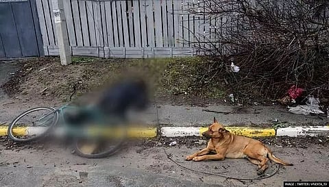 In a recent viral picture from the Russian hit country, a dog is seen sitting near his dead owner, who is killed by Russian invaders.