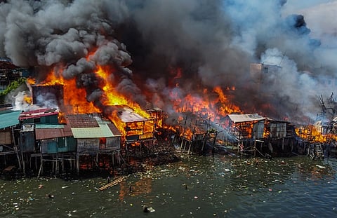 The Philippine Air Force used helicopters to drop water over the burning colony of illegal settlers by the Manila Bay.