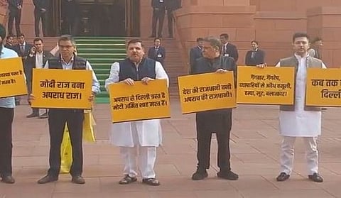 New Delhi: Members of the Aam Aadmi Party (AAP) staged a protest on Wednesday, demanding immediate action from the Union government to address the worsening law and order situation in the national Capital. The protest, led by Delhi Minister Gopal Rai and other AAP MLAs, highlighted the surge in crimes under the jurisdiction of the Union Home Ministry, which oversees Delhi’s law enforcement through the Lieutenant Governor (LG) and Delhi Police. Speaking at the protest, Gopal Rai expressed grave concerns about the safety of Delhi’s citizens, claiming the city is turning into a “crime capital.”