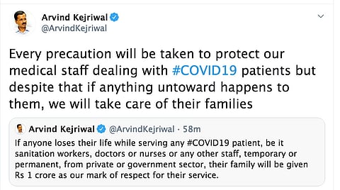 NEW DELHI: Arvind Kejriwal, Chief Minister of Delhi has announced a sum of Rs 1 crore for families of sanitation workers, doctors or nurses or any other staff, temporary or permanent, from private or government sector, if they die while treating patients.