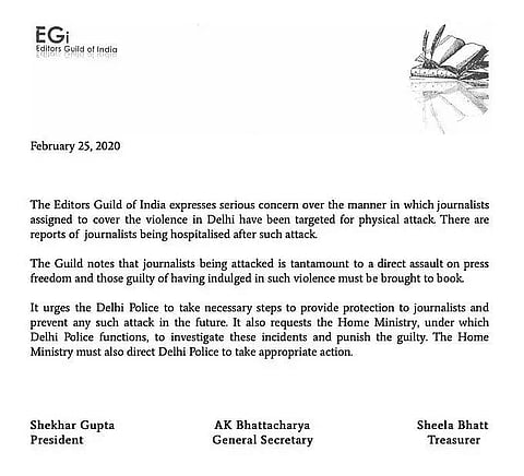 NEW DELHI: After several journalists were attacked during the riots in Delhi, the Editors Guild of India has issued a statement asking the Home Ministry to investigate such incidents and punish the guilty.