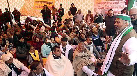 GURUGRAM: Bharatiya Kisan Union (BKU) leader Rakesh Tikait who reached the protest site in Gurugram on Sunday to support the ongoing farmers' stir in the national capital, while addressing the people at the protest site, said that the agitation will not end till the government rolls back the new agricultural laws.