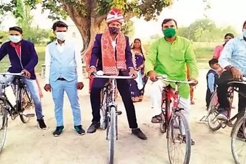 Ajay Krantikari, head of ParyawaranSena, an organization working for environment protection, said, "We have been constantly promoting the concept of 'green weddings' in villages, blocks and cities across the country. In the Corona wave, a limited number of 'baraatis' peddled from one village to another to spread the message of social distancing and wearing of masks." All the baraatis were wearing masks and maintaining adequate distance from each other while cycling from Bojhi village to Rajgarh.