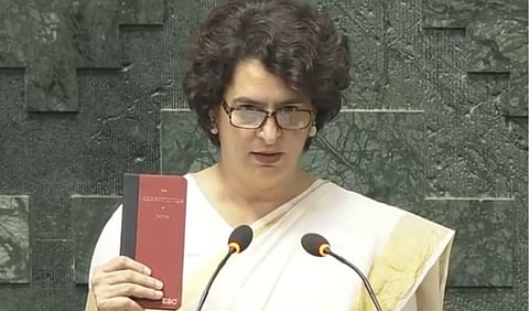 Wearing an off-white saree with a golden border and holding the Constitution booklet, which has become a familiar sight in this Parliament session after Rahul Gandhi and other MPs of the INDIA bloc started carrying it, Priyanka Gandhi was greeted with loud cheers and chants of Bharat Jodo as she took the oath.