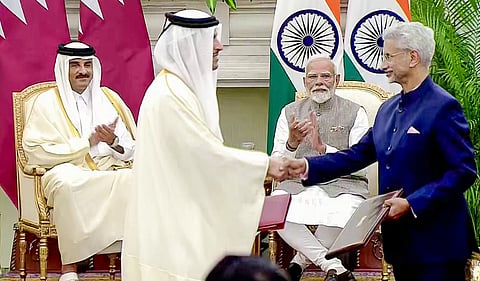 Earlier today, India and Qatar signed an agreement to formally elevate their relations to a strategic partnership and exchanged multiple memorandums of understanding (MoU) with a focus on trade, energy, investments, innovation, technology, food security, culture & people-to-people ties. (ANI)