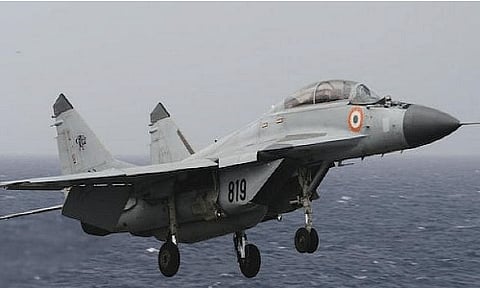 Panaji: An Indian Navy MiG 29k twin-seater trainer aircraft crashed a short distance from the Dabolim international airport on Saturday after its engine caught fire following a bird-hit, the Indian Navy said. The two pilots Captain M. Sheokhand and Lt. Cdr. Deepak Yadav have ejected safely. The Indian Navy has instituted an inquiry into the incident, a statement said. "At about 11.45 a.m. this morning, a MiG twin-seater aircraft on a routine training sortie encountered a flock of birds after take off from INS Hansa airbase at Dabolim, Goa. The pilot observed the left engine had flamed out and the right engine had caught fire," the Indian Navy statement said.