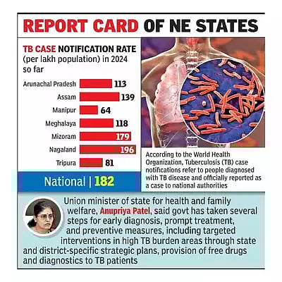 NEW DELHI: The northeast is not new to fighting diseases, and government data also reflects the same with the number of tuberculosis (TB) case notifications at the lowest in five states and Union Territories. This group includes Manipur and Tripura, which registered fewer than 100 cases of TB per lakh population in 2024.