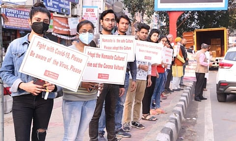 NEW DELHI: The first-ever of its kind, a cultural procession for health named ‘Namaste March’ was taken out in the vicinity of Laxmi Nagar in the national capital on Saturday to make people aware about ways to ward off the contagious Covid-19 which is wreaking havoc all over the world.