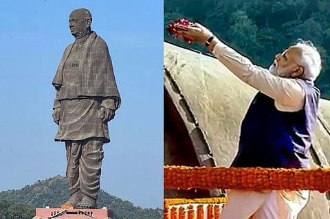 Kevadia (Gujarat): Prime Minister Narendra Modi on Thursday paid floral tributes to Sardar Vallabhbhai Patel at the Statue of Unity in Kevadia on his 144th birth anniversary. The day is celebrated as Rashtriya Ekta Divas. Later, he administered the unity pledge to the hundreds of government personnel gathered there. Earlier Modi tweeted: “Tributes to the great Sardar Patel on his Jayanti. His contribution to our nation is monumental.” (IANS)