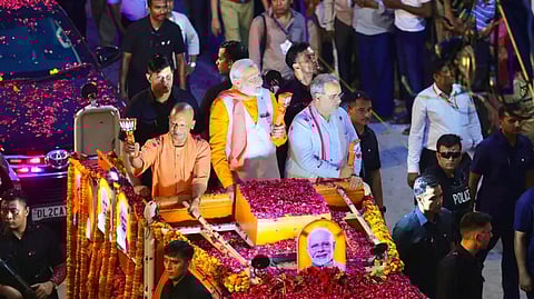 He was accompanied by UP Chief Minister Yogi Adityanath, before state BJP President Bhupendra Chaudhary joined in later. The roadshow began amid the beating of drums, blowing of conch shells, and chanting of mantras, lending to the occasion a festive mood in the middle of the Lok Sabha election campaign.
